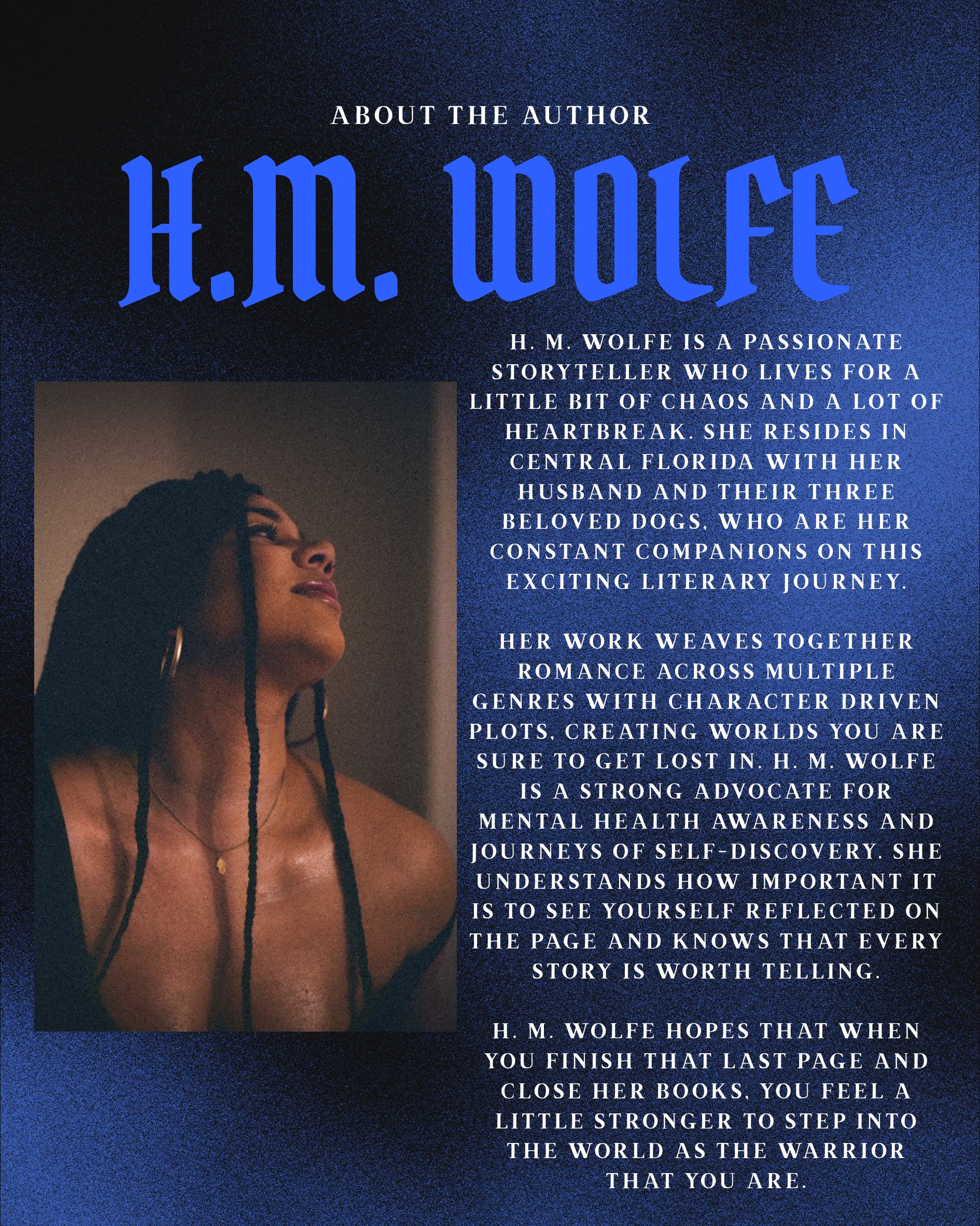 H. M. Wolfe is a passionate storyteller who lives for a little bit of chaos and a lot of heartbreak. She resides in Central Florida with her husband and their three beloved dogs, who are her constant companions on this exciting literary journey.